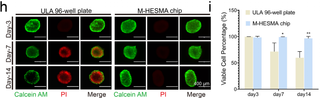 在M-HESMA芯片培養(yǎng)的細(xì)胞球壞死率更低