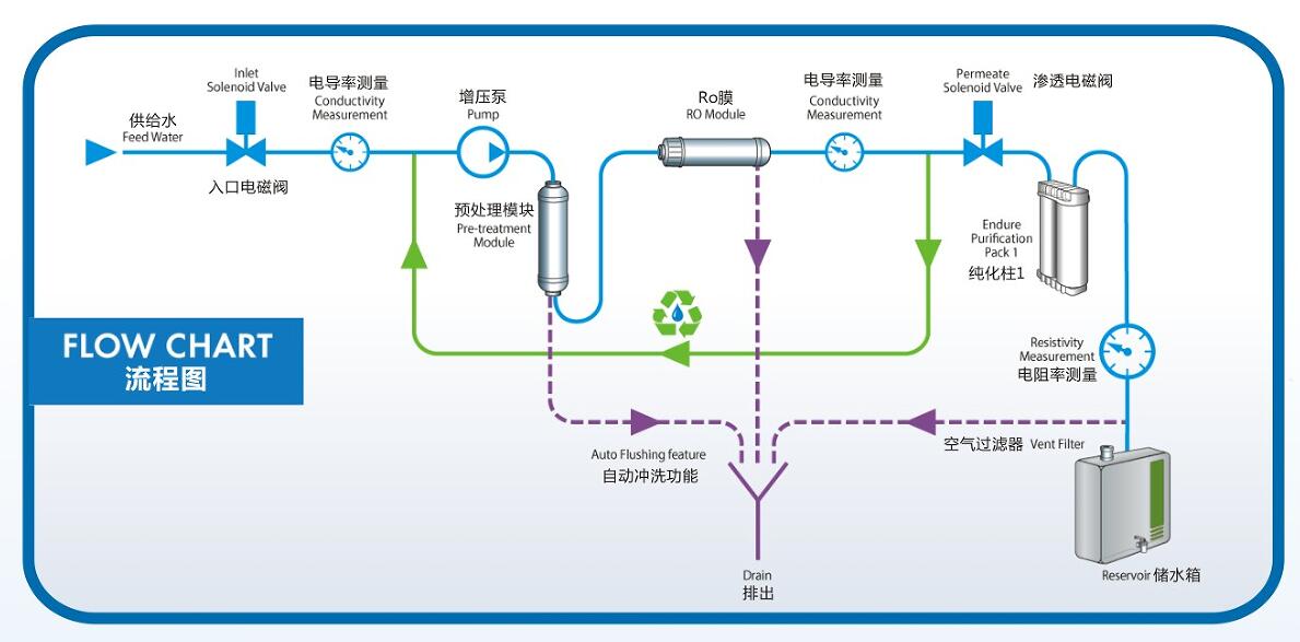 在RO純化過程中,不符合要求的水并未流入下一個純化環(huán)節(jié),而是重新回流至RO步驟中繼續(xù)反滲透,只有達到標準的水才能進入DI環(huán)節(jié)進行去離子純化。因此,DI耗材包只接觸到了純凈的RO水,一定程度上增加了其使用壽命。